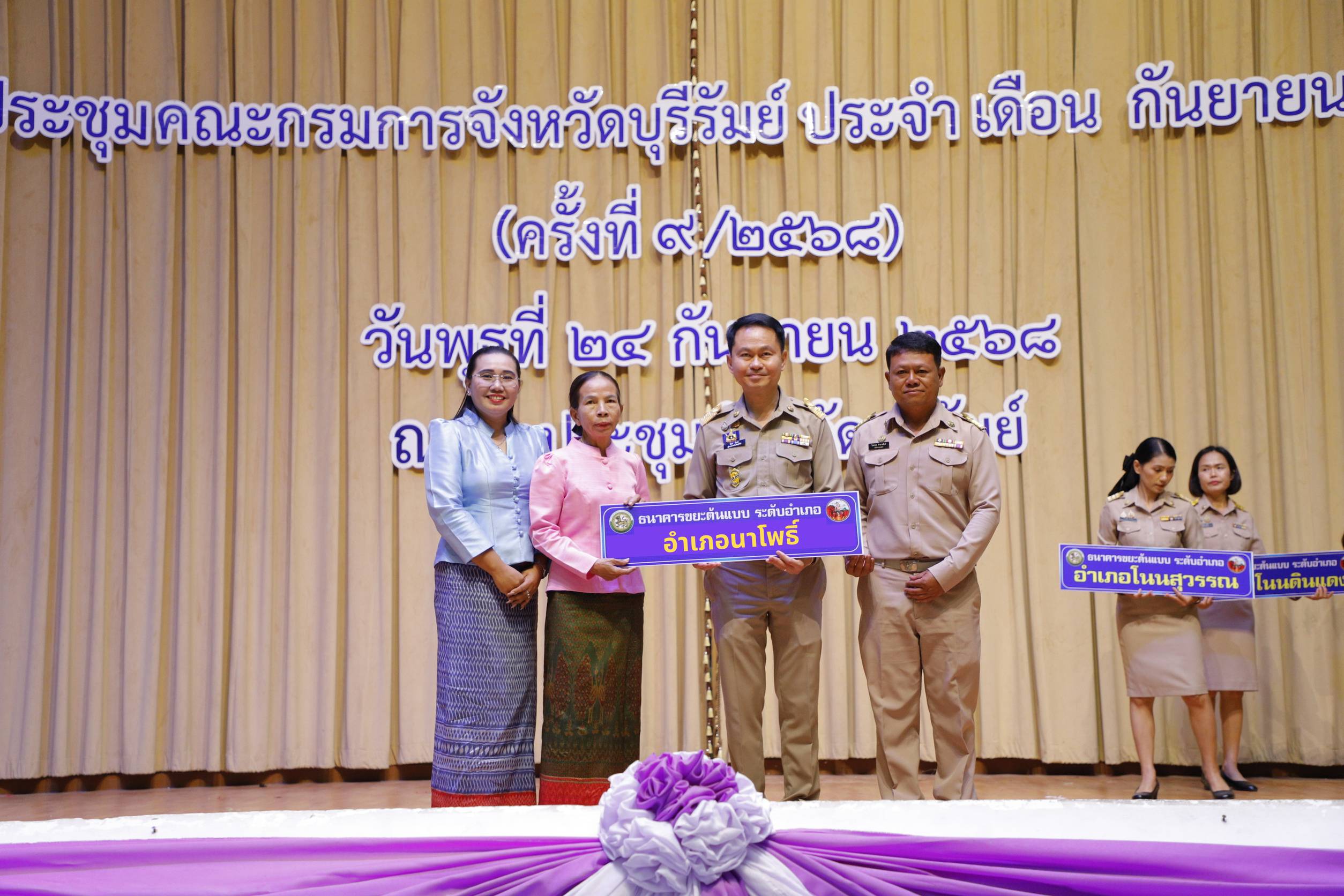 นายศรีธรรม ราชแก้ว รองผู้ว่าราชการจังหวัด ปฏิบัติหน้าที่แทน ผู้ว่าราชการจังหวัดบุรีรัมย์ มอบป้ายธนาคารขยะต้นแบบ ระดับอำเภอ ประจำปี ๒๕๖๘ ให้กับ ธนาคารขยะบ้านจอก หมู่ที่ ๓ ตำบลนาโพธิ์ อำเภอนาโพธิ์ จังหวัดบุรีรัมย์ เพื่อเป็นการสร้างขวัญและกำลังใจให้แก่หมู่บ้าน/ชุมชน และองค์กรปกครองส่วนท้องถิ่น