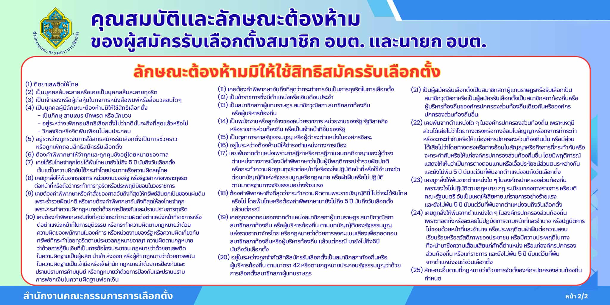 คุณสมบัติและลักษณะต้องห้ามของผู้สมัครรับเลือกตั้งสมาชิกสภาองค์การบริหารส่วนตำบลและนายกองค์การบริหารส่วนตำบล |